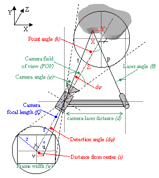 - The relative topology of the arrangement, i.e. the camera and laser angles φ and θ and the distance between them (d)